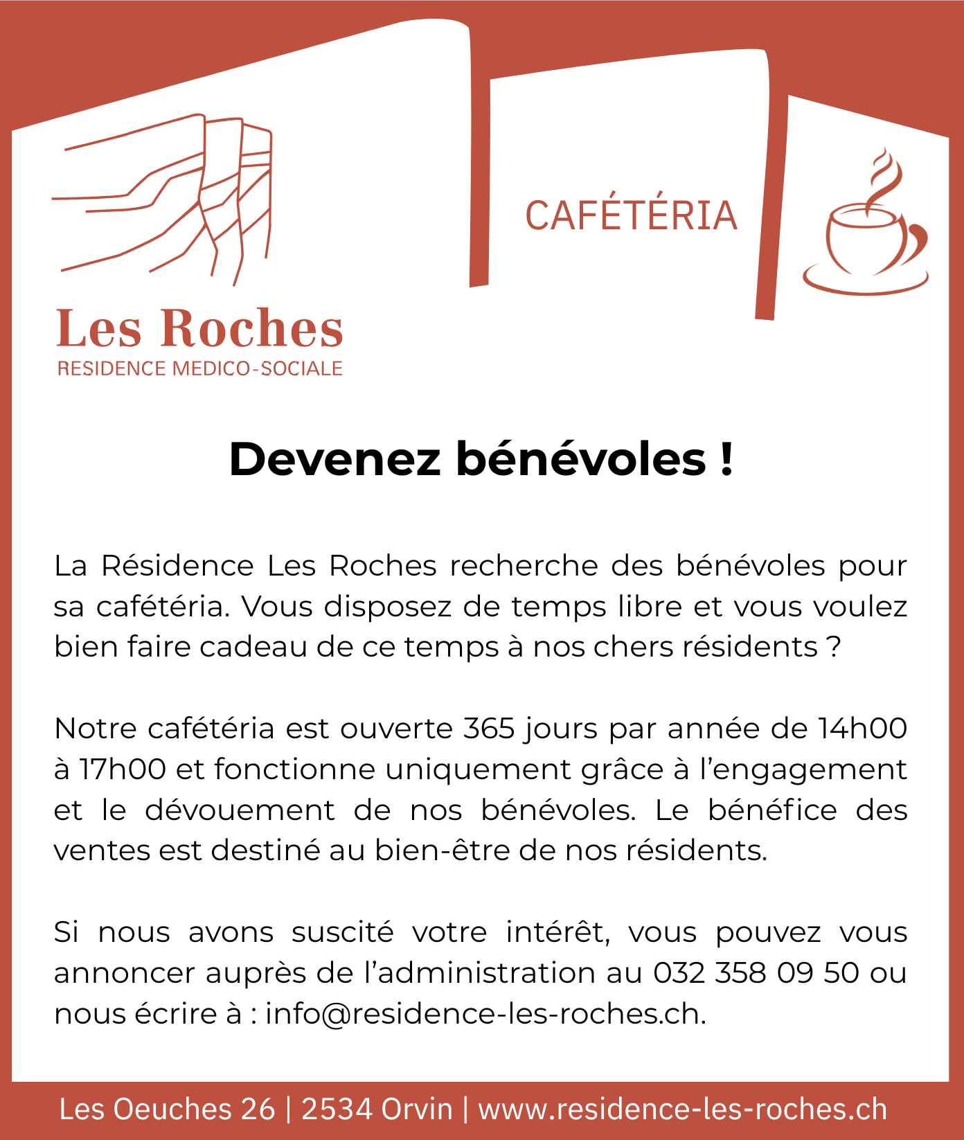 La Résidence Les Roches est un établissement médico-social pour personnes âgées situé à Orvin. L’institution accueille également des personnes atteintes de la maladie d’Alzheimer dans son unité nommée « Arc-en-ciel », spécialisée dans la prise en charge des troubles de l’orientation. Une chambre de vacances ou de convalescence est réservée à l’accueil de durée limitée.